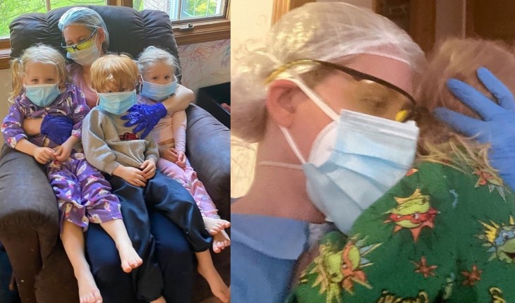A mãe precisou fazer uso de luvas, máscara e óculos de proteção para cuidar dos filhos.