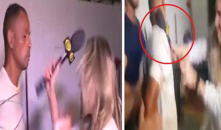 homem decidiu hostilizar repórter da TV Bandeirantes na saída de delegacia, mas acabou levando “microfonadas”.