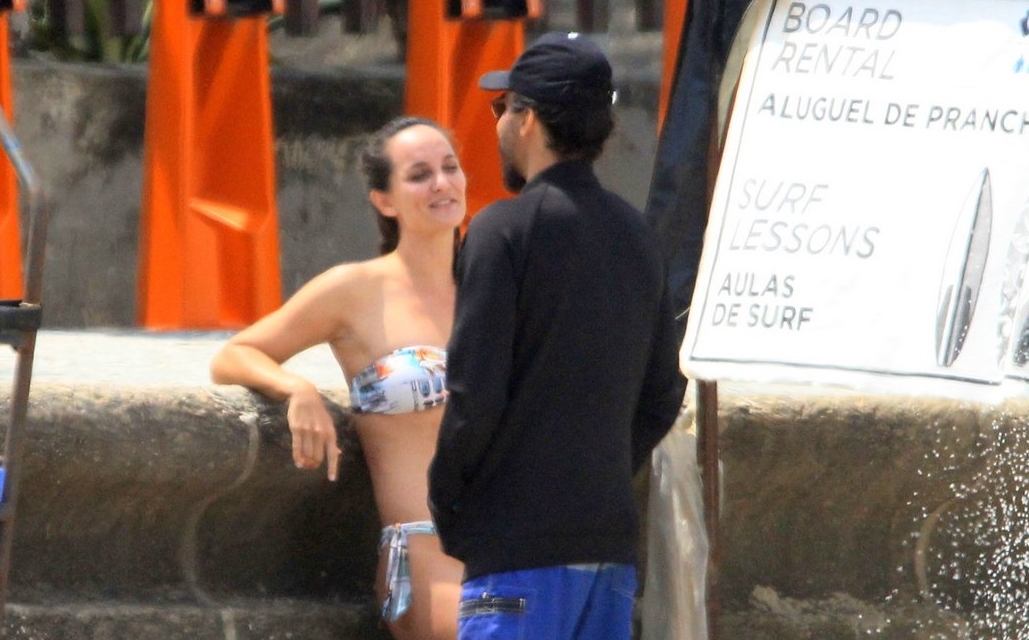 O ator estava todo equipado, enquanto a menina aparecia bem a vontade somente de biquíni.