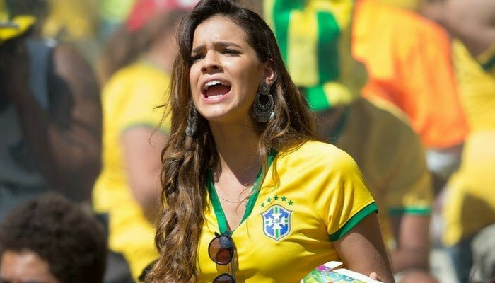 A atriz Bruna Marquezine usa look considerado ousado no jogo do Brasil, em que o seu namorado Neymar aparece como um dos principais craques do time brasileiro.