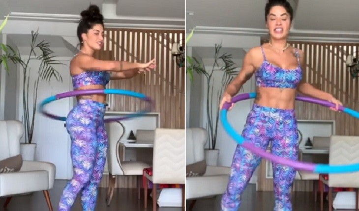 A modelo mostrou que tem muito talento para a dança e chamou os seguidores para o desafio do bambolê.