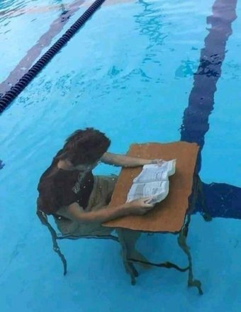 Tem gente que reclama da falta de silêncio para estudar. O aluno abaixo não se intimidou e decidiu provar que era nota 10 até debaixo d’água: