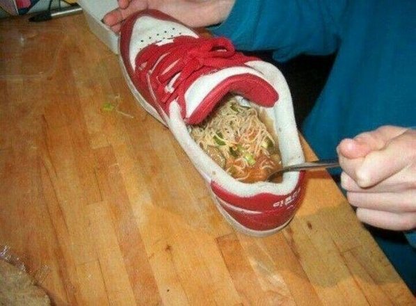 Já na imagem, a seguir, alguém estava sem um prato para comer o seu macarrão e decidiu fazer isso usando o bom e velho tênis: