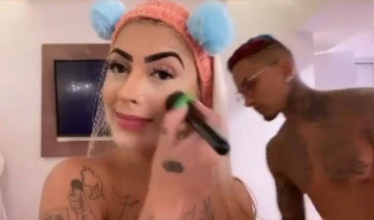 Tudo começa quando a funkeira, que é uma das juradas do Programa Raul Gil, do SBT, aparece no quarto fazendo maquiagem. Ela, aparentemente, está sem roupa, assim como seu namorado, que nas imagens aparece sem camisa e exibindo as várias tatuagens que tem pelo corpo. Enquanto se maquia, ele se abaixa. Dynho Alves some do vídeo e a MC começa a fazer caras diferentes no vídeo.
