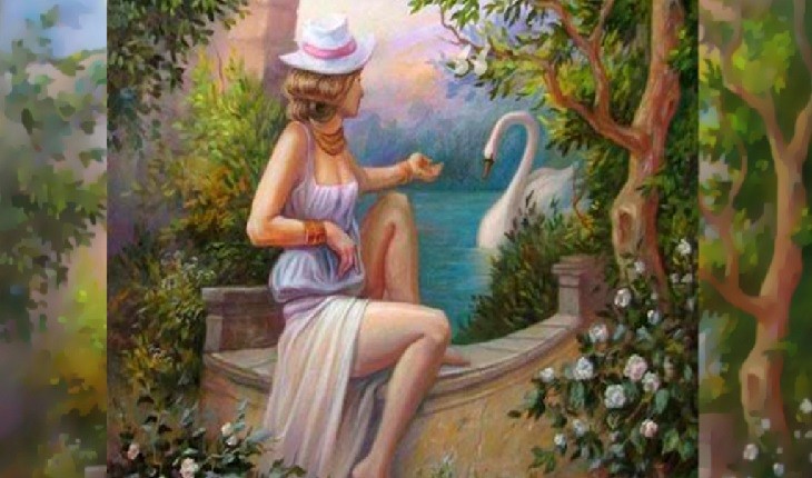 Se você não foi capaz de achar o que foi pedido, não fique triste, a resposta será mostrada na figura abaixo. O rosto do homem foi formado por elementos da imagem. Uma das árvores é o cabelo do indivíduo, enquanto o cisne é sua orelha. Além disso, o braço da mulher faz parte do nariz, uma parte do vestido é a boca e outra parte é o queixo. Veja abaixo: