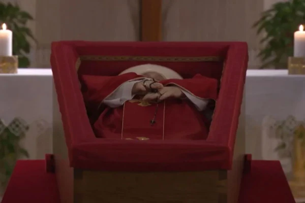 A imagem solene mostra o caixão simples, que segue a tradição dos funerais papais. O Papa Francisco faleceu aos 88 anos, após sofrer um acidente vascular cerebral (AVC) seguido de uma falência cardíaca irreversível.
