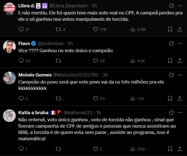 A escolha de se autodeclarar como campeão, em contraposição ao resultado oficial, onde Renata levou o título, gerou uma série de reações entre os fãs e internautas nas redes sociais. O programa deste ano foi marcado por um modelo de votação híbrido, no qual as duas modalidades de votação, uma única vez por pessoa e a votação ilimitada, que influenciaram diretamente no resultado.
