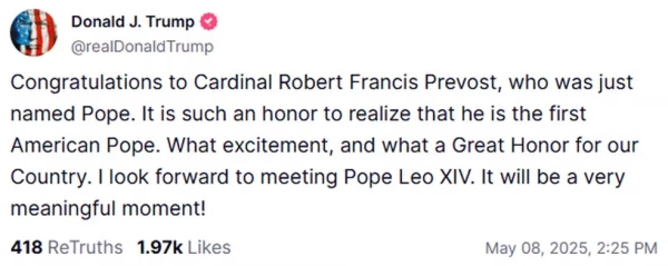 Nesta quinta (8), Donald Trump dez questão de parabenizar Prevost, afirmando que seria uma grande hora ter um papa dos Estados Unidos. “Parabéns aocardeal Robert Francis Prevost, que foi nomeado papa. Não vejo a hora de conhecer o papa Leão XVI. Será um momento significativo“, escreveu o presidente dos EUA.