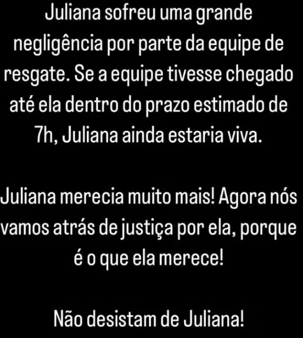 Em uma mensagem emotiva publicada no Instagram, a família afirmou que, se o socorro tivesse chegado dentro do prazo estimado de sete horas, Juliana ainda estaria viva.