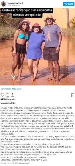 De forma especial, a presença dela continua em seu coração, no da mãe e no da irmã. Manoel concluiu com uma despedida emocionada: “Voa, Juju, voa. Voa para os braços do Pai Eterno que lhe aguarda para te guardar para sempre nos seus braços de amor infinito”.