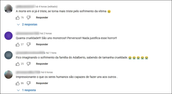 “Fico imaginando o sofrimento da família do Adalberto, sabendo de tamanha crueldade”, comentou mais um. “Quanta crueldade. São uns monstros. Perversos. Nada justifica esse horror”, disparou mais uma. As reações mostram o impacto que o caso tem causado na população, que acompanha os desdobramentos com expectativa por justiça.