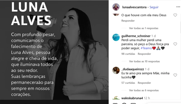 Luna Alves, cantora de 39 anos, morreu na madrugada de domingo (10), em Cuiabá (MT) vítima de um infarto. Horas antes, a artista havia realizado uma apresentação no Parque das Nações, na capital mato-grossense. Após o show, Luna voltou para casa e publicou em suas redes sociais uma mensagem agradecendo pelo dom da vida e pelo reconhecimento do público.