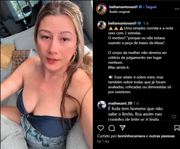 Bella Mantovani usou as redes sociais para denunciar uma suposta discriminação sofrida em corrida de aplicativo por não usar sutiã.