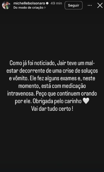Segundo ela, a equipe médica tem dedicado atenção constante ao caso, buscando estabilizar a saúde do político. A ex-primeira-dama também agradeceu as mensagens de apoio e destacou a importância da solidariedade neste momento. “Ele fez alguns exames e, neste momento, está com medicação”, afirmou Michelle Bolsonaro.