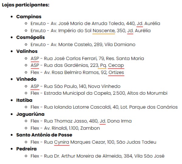 O processo seletivo ocorrerá de forma simultânea em diversas lojas das redes, distribuídas por várias cidades da região de Campinas. Os interessados devem se dirigir a um dos endereços listados abaixo com currículo e documento com foto.