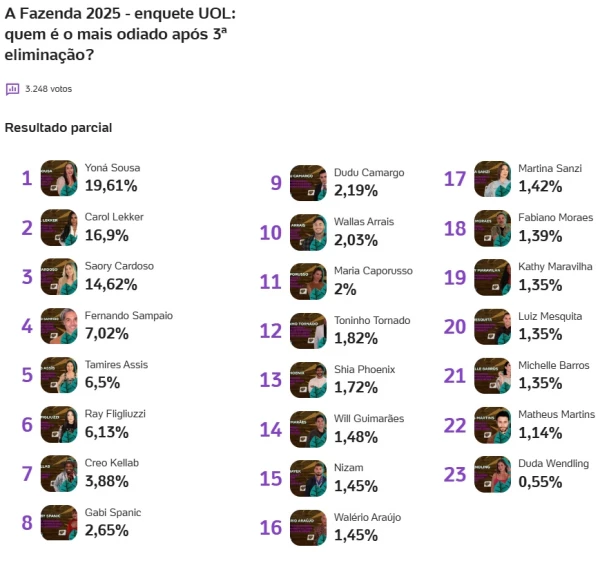 Os resultados da enquete mostram ainda que outros peões, como Fernando Sampaio e Tamires Assis, têm rejeição menor, indicando que nem todas as atitudes polêmicas causam repulsa. A audiência de A Fazenda 17 segue de olho em cada passo dos participantes, e Yoná se tornou o principal personagem controverso do momento.