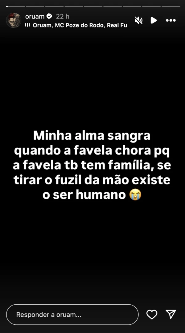 “Minha alma sangra quando a favela chora, porque a favela também tem família. Se tirar o fuzil da mão, existe um ser humano”, escreveu. Em outra publicação, Oruam criticou a forma como as ações policiais são conduzidas. Segundo ele, a violência é reflexo da falta de oportunidades. “O crime é o reflexo da sociedade”, publicou no X (antigo Twitter), destacando que o problema não se resolve com sangue nas ruas.