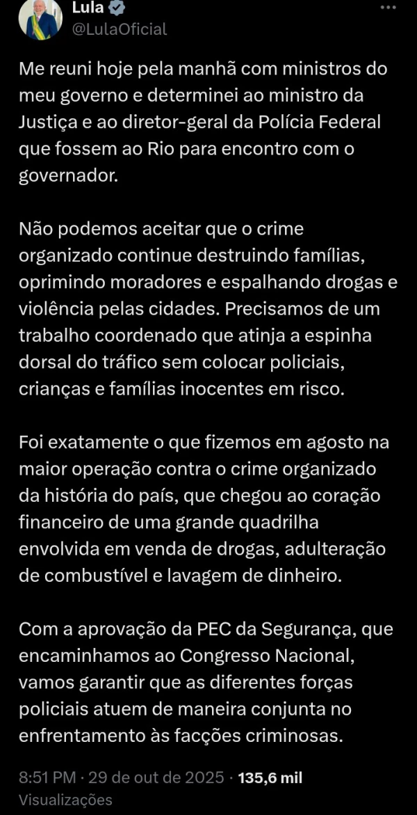 Luiz Inácio Lula da Silva (PT) manifestou-se na noite desta quarta-feira (29/10) a respeito da megaoperação policial nos complexos do Alemão e da Penha, no Rio de Janeiro, que deixou 119 mortos. Em uma publicação na rede social X (antigo Twitter), o petista cobrou um “trabalho coordenado que atinja a espinha dorsal do tráfico“, ressaltando a importância de proteger a população.