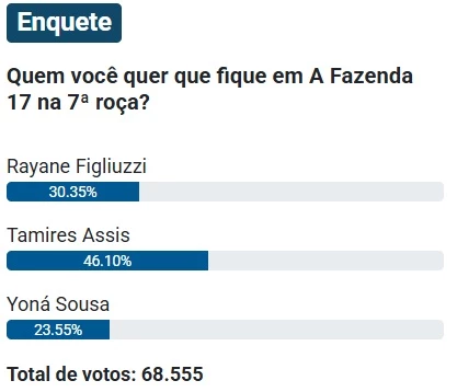 Até às 16h30 desta quinta-feira (6), a enquete já contabilizava quase 69 mil votos, mostrando o grande envolvimento do público e a expectativa crescente para o resultado oficial da sétima eliminação de A Fazenda 17.