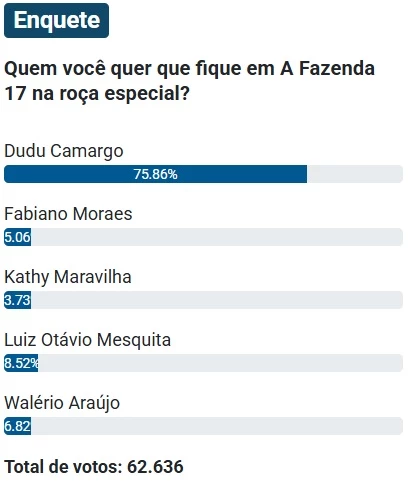 Na parcial, Dudu Camargo aparece como o favorito para ficar, com expressivos 75,86% dos votos. Em seguida surgem Luiz Otávio Mesquita, com 8,52%, e Walério Araújo, que soma 6,82%. Fabiano Moraes obteve 5,06%, enquanto Kathy Maravilha ficou com 3,73%. Ao todo, a enquete contabilizou 62.636 votos, mostrando forte engajamento dos fãs do reality.