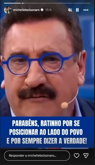 A manifestação de apoio foi feita por Michelle Bolsonaro nos stories de seu perfil oficial no Instagram, onde ela compartilhou um dos vídeos do apresentador e escreveu: “Parabéns, Ratinho, por se posicionar ao lado do povo e por sempre dizer a verdade”.