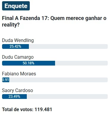 De acordo com a enquete do Notícias da TV, Dudu Camargo lidera com folga a preferência popular. A parcial atualizada, que já ultrapassou 119 mil votos, mostra o ex-apresentador do SBT com 50,18%, percentual que o coloca em posição confortável e reforça seu favoritismo absoluto na reta decisiva do programa.