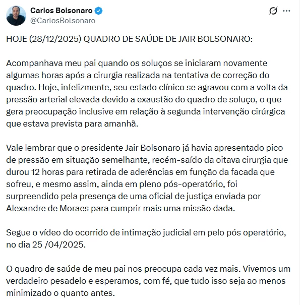 Diante do novo cenário, Carlos Bolsonaro descreve o momento como delicado e emocionalmente desgastante. A expectativa é de que o acompanhamento médico contínuo ajude a estabilizar o quadro e reduzir os riscos associados, enquanto todos aguardam, com apreensão, a definição sobre novas intervenções e a evolução clínica do ex-presidente.