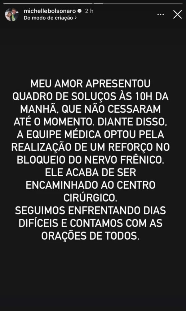 A ex-primeira-dama Michelle Bolsonaro utilizou seus perfis em redes sociais nesta terça-feira, 30 de dezembro, para divulgar atualizações sobre a condição clínica de seu esposo, o ex-presidente Jair Bolsonaro. De acordo com as informações compartilhadas publicamente, ele necessitou ser encaminhado novamente ao centro cirúrgico hospitalar em decorrência de um novo episódio persistente de soluços.