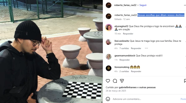 Meses depois, em março, o jovem fez outra publicação reflexiva: uma foto em que aparece sentado em frente a um tabuleiro de xadrez, acompanhada da frase “Nossas escolhas que ditam nossos destinos”. Após o desaparecimento, a legenda passou a ser interpretada como uma triste coincidência, já que Roberto optou por enfrentar uma trilha considerada extrema, decisão que acabou resultando em seu sumiço.