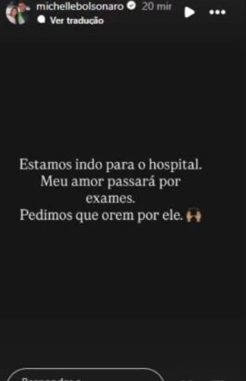 Em uma publicação nos Stories do Instagram, Michelle Bolsonaro afirmou que o marido seria levado ao hospital para avaliação médica e pediu apoio espiritual aos seguidores. “Estamos indo para o hospital. Meu amor passará por exames. Pedimos que orem por ele”, escreveu, em tom de apreensão.