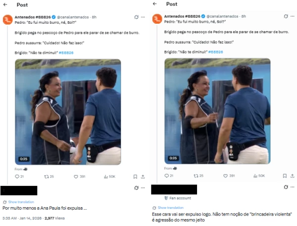 Internautas passaram a pedir a expulsão do brother, alegando que a atitude ultrapassou o limite de uma brincadeira. “Esse cara vai ser expulso logo. Não tem noção que ‘brincadeira violenta’ é agressão do mesmo jeito”, escreveu um usuário. Outro lembrou casos anteriores: “Por muito menos a Ana Paula foi expulsa”.