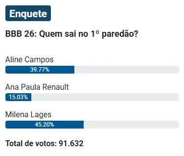 Segundo a enquete do Notícias da TV, o público começa a definir suas preferências logo na estreia das eliminações. Milena Lages lidera a rejeição, somando 45,20% dos votos. Em seguida aparece Aline Campos, com 39,77%. Ana Paula Renault surge em posição mais confortável para permanecer no BBB26, registrando 15,03% até o momento.
