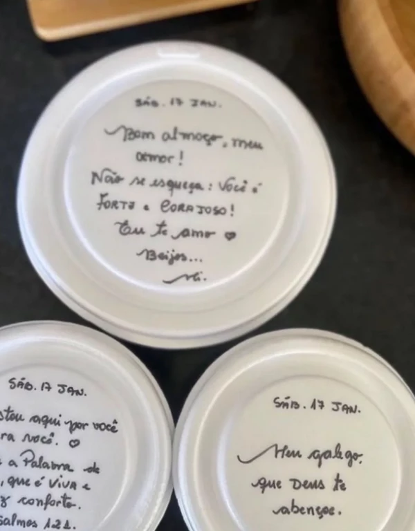 A própria ex-primeira-dama compartilhou em suas redes sociais, uma imagem de seus recados escritos nas marmitas, em uma delas havia a mensagem: “Bom almoço, meu amor! Não se esqueça: você é forte e corajoso! Eu te amo. Beijos, Mi”.