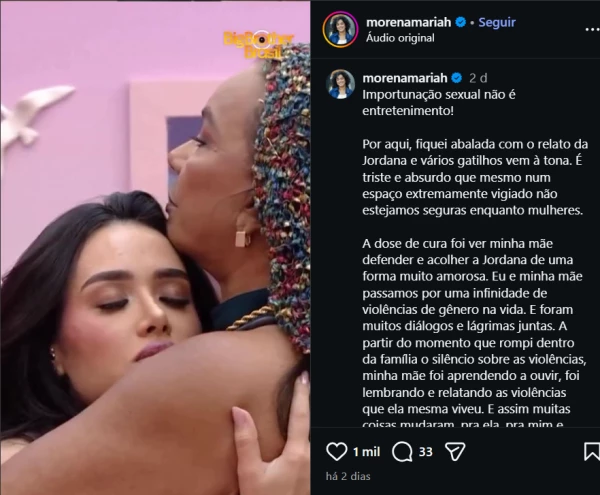 Morena afirmou que Solange Couto ficou profundamente abalada e decepcionada com o comportamento de Pedro no confinamento, ressaltando que ele agiu daquela forma mesmo ciente da presença das câmeras. Além disso, Morena celebrou o apoio que a mãe deu a Jordana, mencionando que se emocionou muito ao vê-las abraçadas.