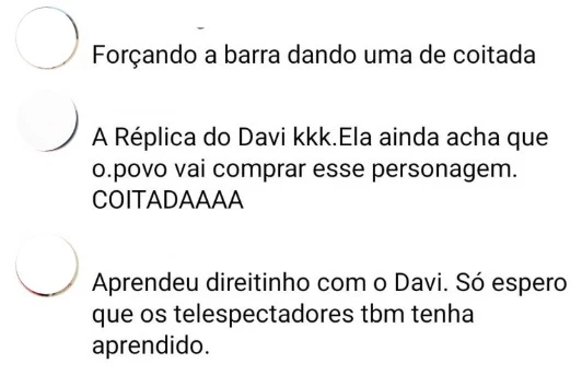 Outras opiniões seguiram a mesma linha crítica e questionaram a autenticidade da sister no jogo. “A réplica do Davi. Ela ainda acha que o povo vai comprar esse personagem” , opinou outro. Já um terceiro foi ainda mais direto: “forçando a barra dando uma de coitada”.