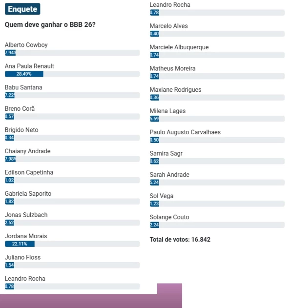 Já na parte inferior do ranking, participantes como Marciele Albuquerque, Samira Sagr e Matheus Moreira não alcançam 1% dos votos. Esse panorama reforça que o BBB 26 vive uma polarização clara. Embora Ana Paula Renault lidere, a parcial deixa evidente que Jordana Morais representa uma ameaça real ao seu domínio, tornando o jogo cada vez mais imprevisível.