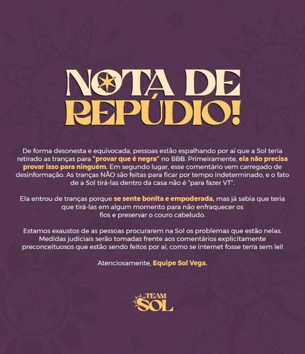 “De forma desonesta e equivocada, pessoas estão espalhando por aí que a Sol teria retirado as tranças para ‘provar que é negra’ no BBB. Primeiramente, ela não precisa provar isso para ninguém. Em segundo lugar, esse comentário vem carregado de desinformação”, inicia o comunicado.