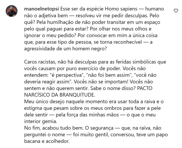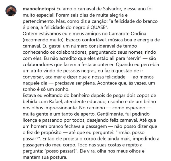 Horas antes do falecimento, Manoel utilizou as redes sociais para relatar um episódio de racismo ocorrido durante o carnaval de Salvador. O psicólogo descreveu que enfrentou constrangimento ao ter a passagem impedida em uma área do Camarote Ondina, localizado no circuito Dodô (Barra-Ondina). O relato não mencionou agressão física, mas revelou abalo emocional e motivou reflexões compartilhadas com seguidores.