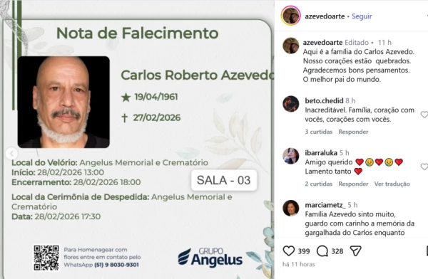 O ator e iluminador gaúcho Carlos Azevedo faleceu nesta sexta-feira, dia 27, aos 65 anos de idade, deixando fãs e amigos chocados com a notícia. A confirmação do falecimento foi divulgada pela família do artista através de suas redes sociais.