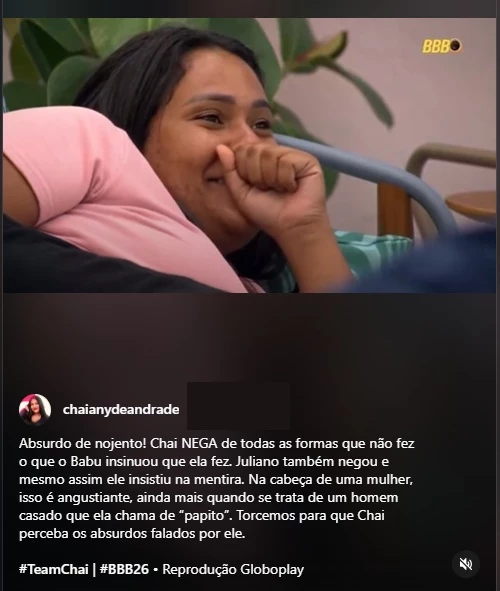 Fora da casa do Big Brother Brasil 26, a equipe de Chaiany publicou uma nota oficial repudiando as declarações e classificando o episódio como uma tentativa de prejudicar a imagem da participante. O caso segue repercutindo intensamente entre fãs do programa.