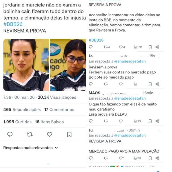 A gravação divulgada na web intensificou os pedidos do público para que a produção reavalie a Prova do Líder. Comentários pedindo justiça chegaram aos assuntos mais comentados da rede social X, antigo Twitter, e alguns internautas ainda apontaram possíveis irregularidades em outras plataformas da prova, ampliando o debate sobre a condução da dinâmica no reality.