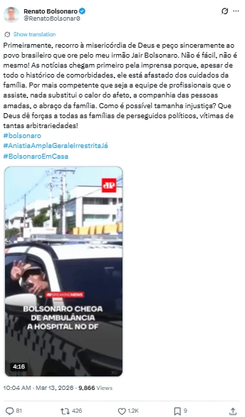 No relato publicado nas redes, o irmão de Bolsonaro ainda questionou o que considera ser uma situação injusta. Renato afirmou esperar que Deus dê força não apenas à sua família, mas também a outras pessoas que, segundo ele, estariam passando por circunstâncias semelhantes.