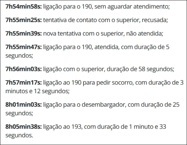 Somente às 7h57 ele fez uma ligação completa solicitando socorro, o que levantou dúvidas sobre a conduta adotada no momento crítico. Além disso, o tenente-coronel também entrou em contato com um desembargador logo após os primeiros telefonemas, o que foi registrado no relatório oficial.