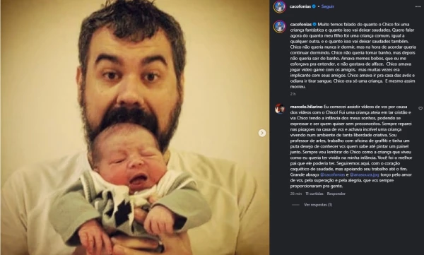 O humorista Vinicius Antunes, conhecido como Cacofonias, emocionou seguidores ao prestar uma homenagem ao filho Francisco Farias Antunes, que morreu após um atropelamento no Rio de Janeiro. O acidente, ocorrido na última segunda-feira (30), também vitimou a mãe do menino, Emanoelle Martins Guedes de Farias, causando grande comoção.