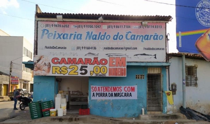 Naldo do Camarão se cansou de orientar clientes para entrarem na loja com máscara e resolveu fazer uma faixa.