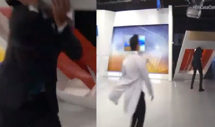 Vídeo: apresentador levou susto e teve que segurar cenário para não ser ainda mais atingido.