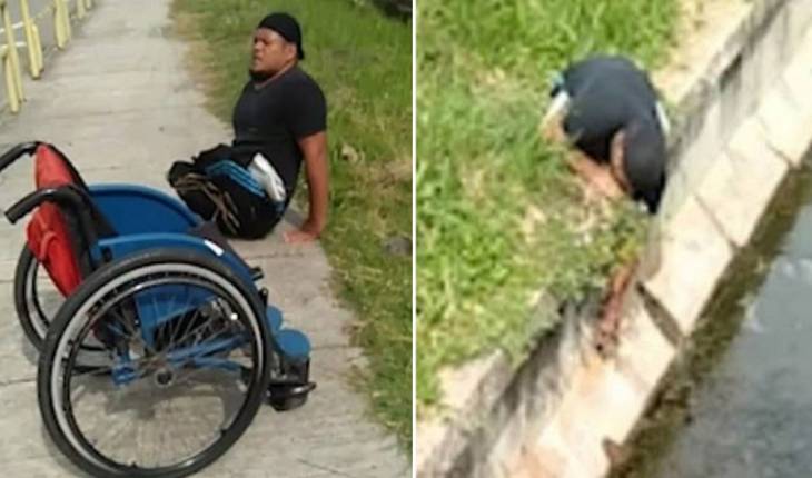 Homem se arrastou até a beira do córrego e se debruçou para salvar o filhote de gato que estava a ponto de cair e se afogar.