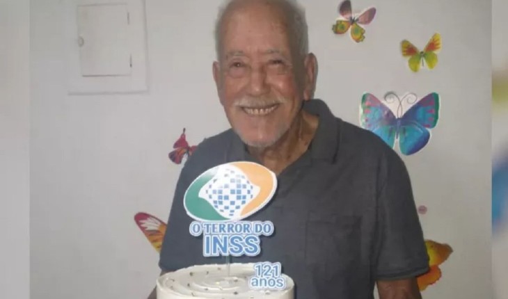 O idoso viralizou nas redes sociais após comemorar seu aniversário de 121 anos com o tema ‘Terror do INSS’.