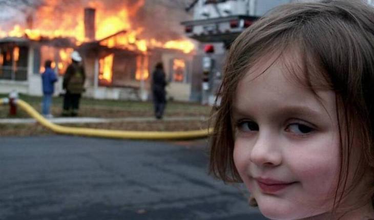 A menina se tornou um viral por conta de sua expressão sádica enquanto um incêndio acontece ao fundo.