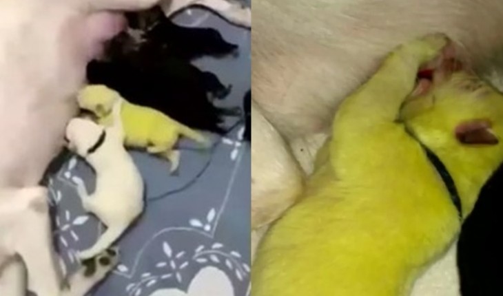 Pastor alemão branco dá à luz 8 cachorros, mas um chama a atenção por ter uma cor incomum.